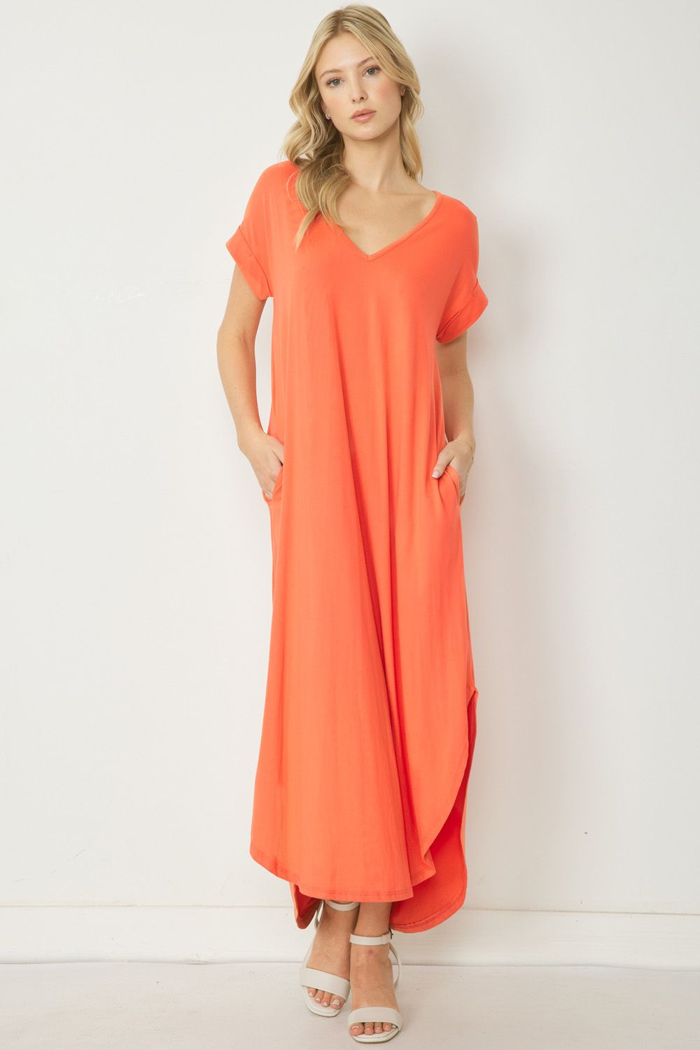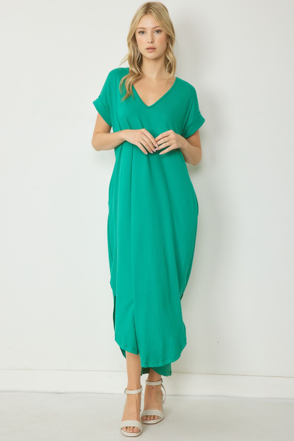 Jersey knit v-neck maxi dress featuring pocket detail at side. Permanent rolled sleeve. Rounded hem. Unlined. Non-sheer. Knit. Lightweight.