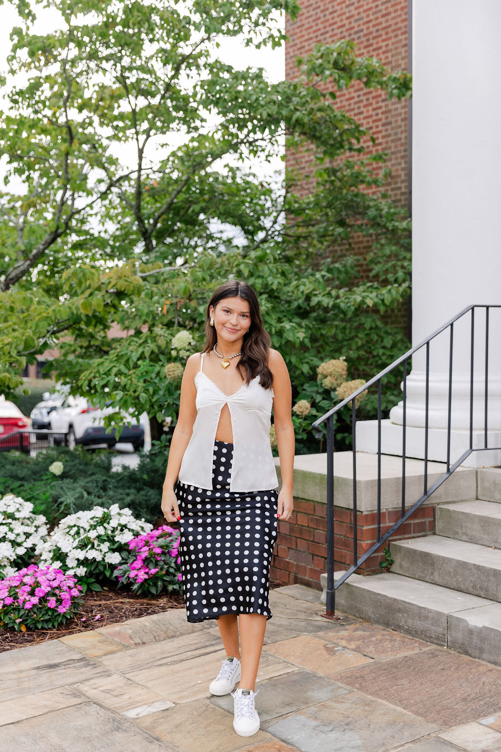 Silky satin + classic polka dots = your new go‑to skirt for brunches, nights out, and everything in between.