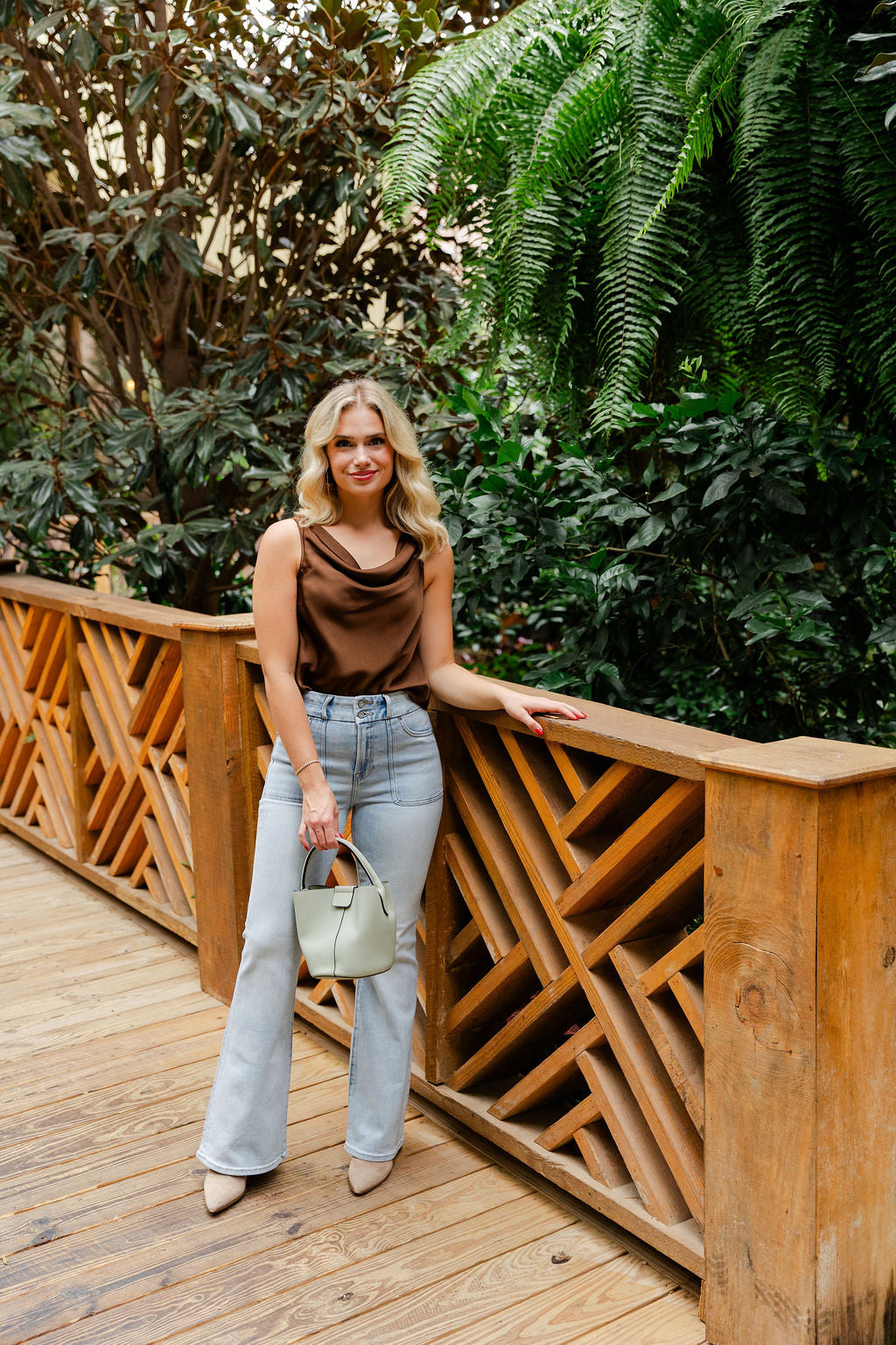 Chic and timeless, this satin drape neck top adds an elegant touch to any outfit. With its soft sheen, flattering neckline, and fluid fit, it’s perfect for dressing up denim or pairing with tailored trousers for a polished look.