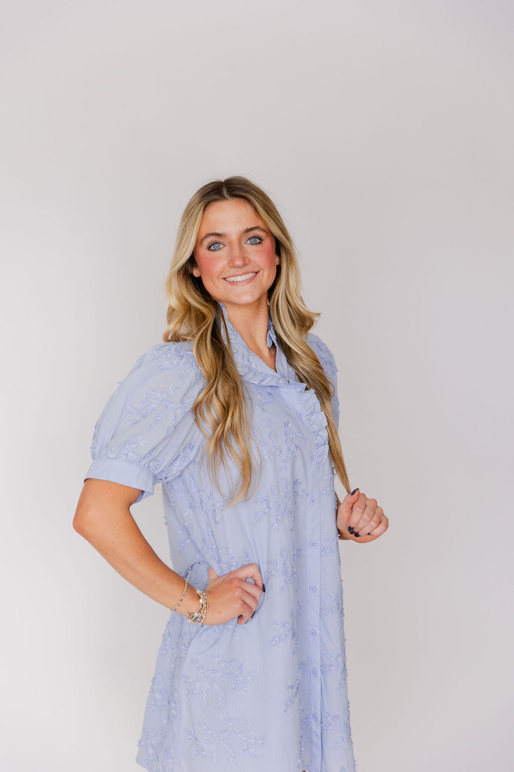 3D floral applique. Functional buttons down the front. Structured short puff sleeve. Pockets. Lined.