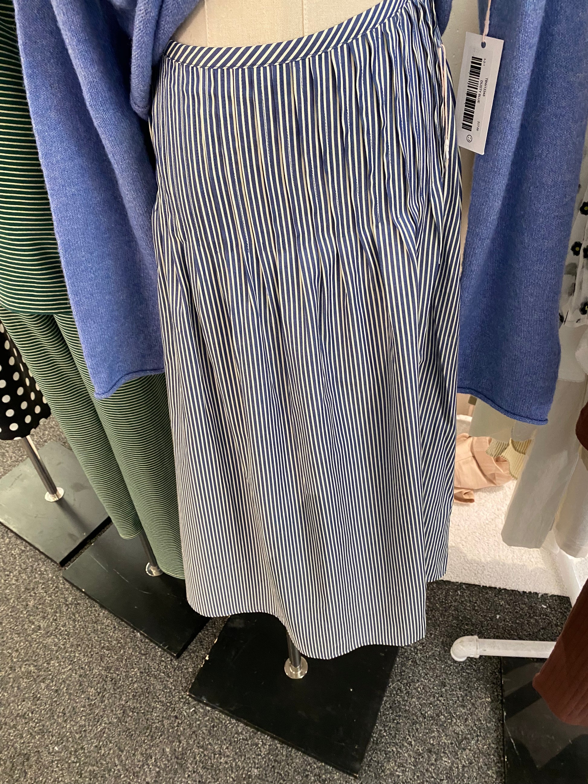 Add a timeless touch to your wardrobe with this striped midi skirt. Featuring a flattering mid-length silhouette and subtle movement with every step, it’s the perfect mix of classic and chic. Style it with a simple knit top or crisp button-down for an effortlessly polished look.